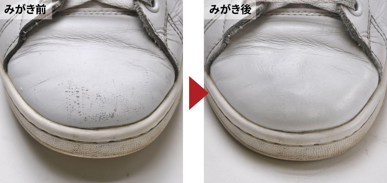 ※今回の実践ご紹介は白のつやのあるレザーでのご案内です。一部のスニーカーは合皮・人工皮革・フェイクレザーの場合もあります。合皮・人工皮革の場合はお手入れ方法が異なります。お手入れ前に素材を十分に確認してくださいね!