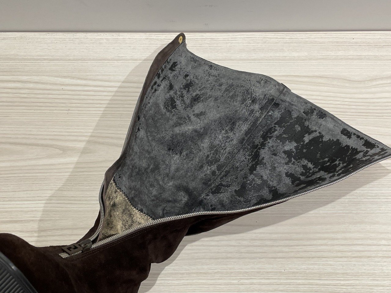 - 靴の内側は合皮が使われる事が多く、長期間保管している間に劣化しやすい部分です。このように素材が劣化し、ポロポロ剥がれていく状態になってしまいます。この場合は、劣化した内側をすべて剥がし、新たに本革で作り直し取り付けるという修理(内張り交換)をいたします。