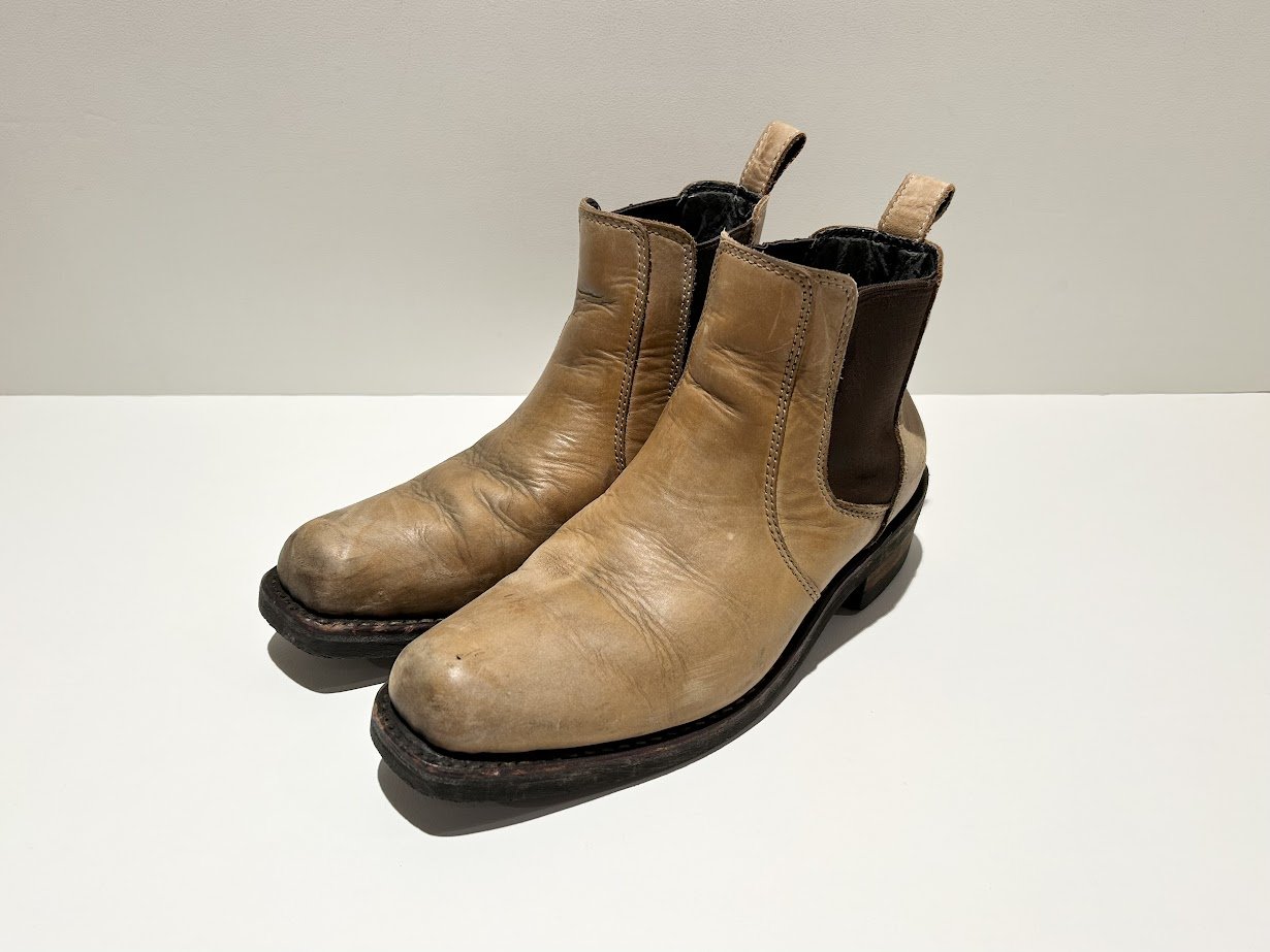 - ブーツのカーブに合わせて型紙を作り、かかと側の底から履き口までを本革で補強しています。本革で補強することで、合皮の経年劣化によるボロボロが再発しにくく丈夫に仕上がりました。