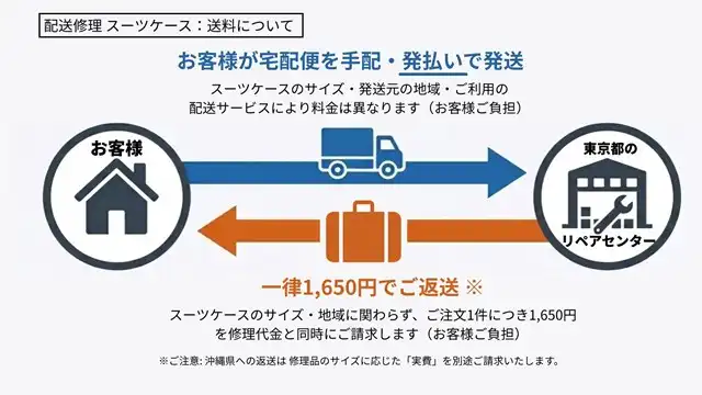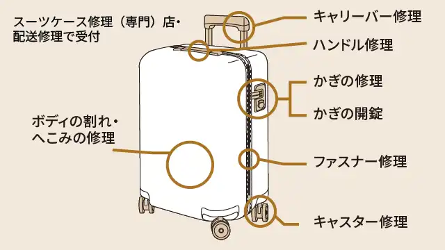 - スーツケースその他の部分の修理は、配送修理かスーツケース修理専門店へ