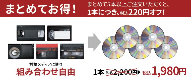 一度に5本以上のご注文で、原版1本あたりのダビングサービス価格が税込220円オトクに!
