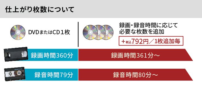 録画時間が360分、録音時間が79分を超える場合は、DVD/CDが複数枚に分かれ、追加したDVD/CD 1枚あたり税込792円いただきます。