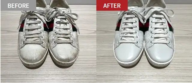 白いレザースニーカーは汚れを落とし、カラーリングがおすすめです。グッチなど高級ブランドスニーカーも多数修理実績があります。工場でのお預かり修理です(一部受付できない店舗があります)